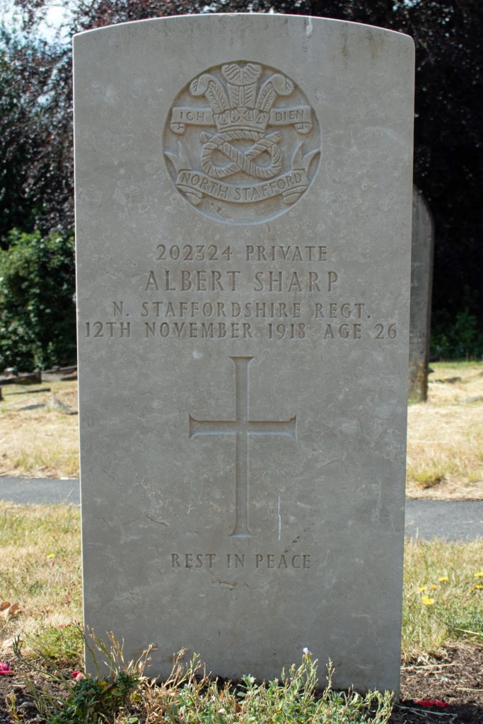 It seems likely that Albert’s family were unable to pay for his body to be taken back to Staffordshire for burial. His service records give only his mother, Janet, as a next of kin, so it would seem that George had passed away by the time Albert enlisted. For some reason, however, while the British Register of Army Effects note that Private Sharp has effects to the value of £39 10s (£2250 in today’s money), this amount does not appear to have been paid. Janet passed away in the early 1920s, and Albert’s brother continued to try and obtain this gratuity on her behalf, but seems to have been unsuccessful.