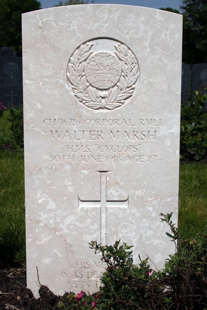 The body of Walter Marsh was laid to rest in the naval section of Woodlands Cemetery, Gillingham, Kent, not far from the base that had become a home from home.